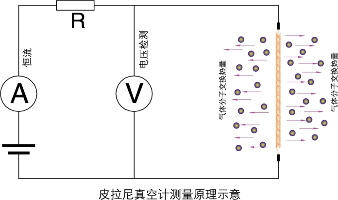 The working principle of the Pirani vacuum gauge is as follows: When a constant current (I) flows through a high-temperature resistant filament (resistance R), the filament heats up. The heat (Q) is exchanged with the surrounding environment in three ways: