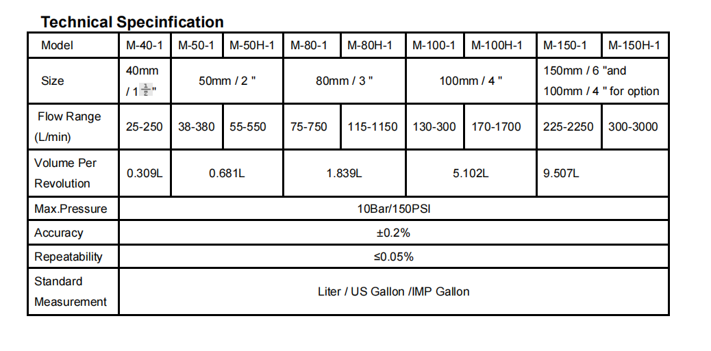 Flow rate: M-40-1 1 1/2”25L-250L/min